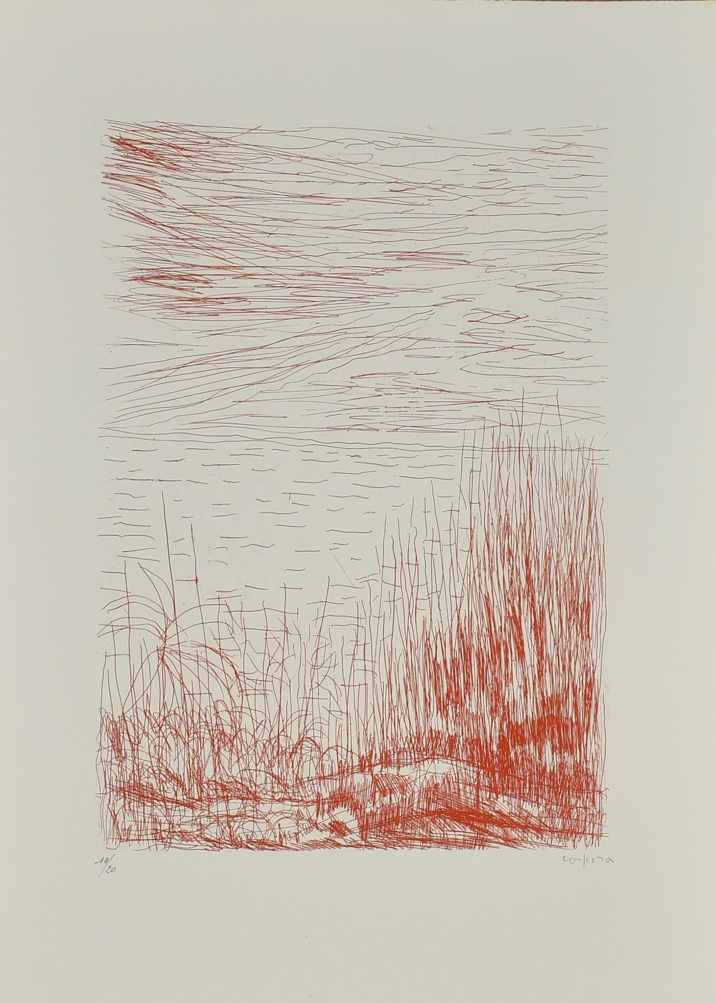 Antonio Corpora CANNETO VARIAZIONE ROSSA acquaforte, battuta cm 49,6x34,5, su...