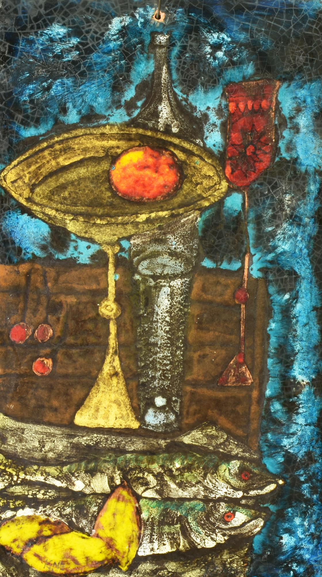 Anonimo NATURA MORTA CON PESCI smalto su terracotta, cm 53x30 eseguita nel...