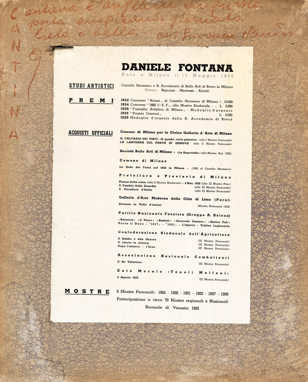 Etichetta relativa a premi e mostre dell'Artista al retro del cartone protettivo
