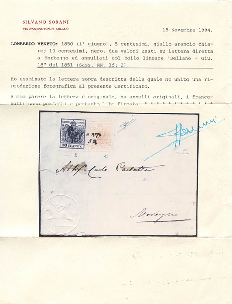 18.6.1851, lettera affrancata per 15c. Tramite un 5c.Giallo Arancio Chiaro N.1f e un 10c. Nero N.2. (A+) (Cert. Sorani) (Cat.1500++)