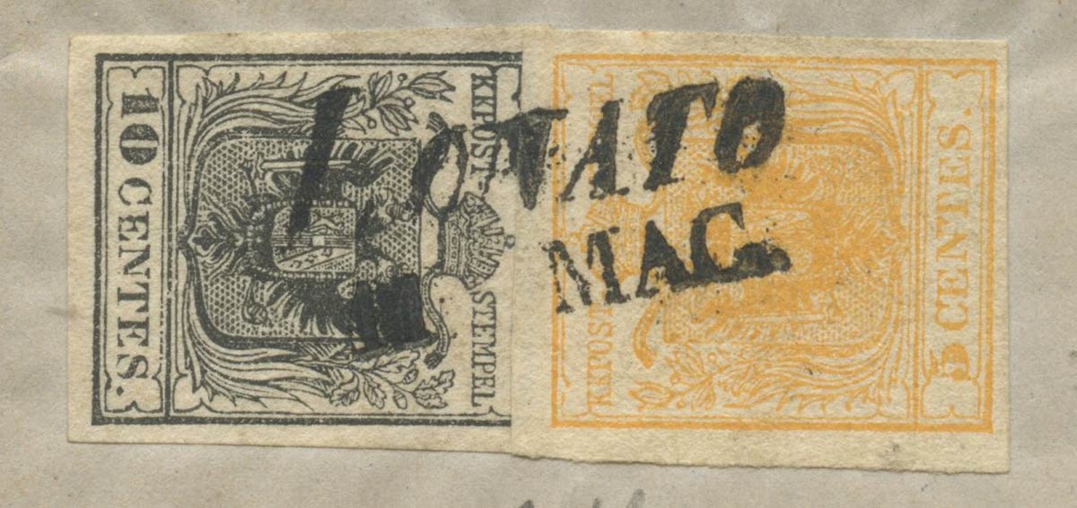 1851, Lettera da Lonato per Avio affrancata per 15 centesimi tramite un 5c. Giallo arancio chiaro N.1f ed un 10c. Nero N.2. Molto interessante il difetto di clichè sulla scritta ''Centes'' del N.2. (Lux) (Colla) (Cat.1500++)