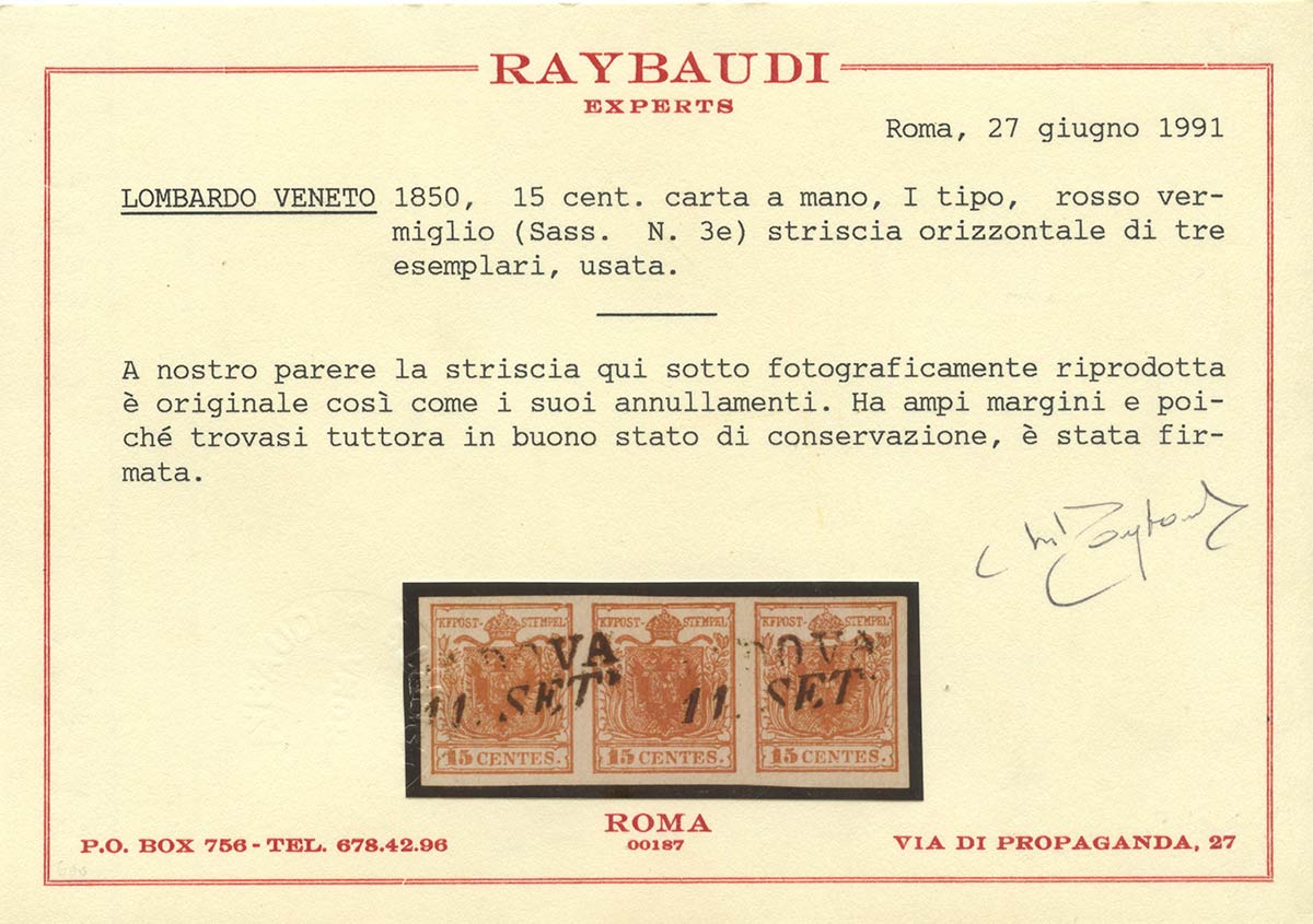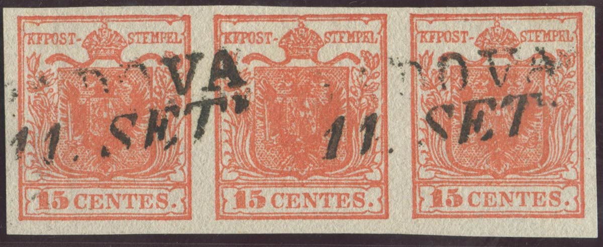 1850, 15c. Rosso Vermiglio N.3e in striscia di tre usata. Il primo esemplare a sinistra presenta due invisibili pieghe. (A-) ( Cert. Raybaudi) (Cat.550)