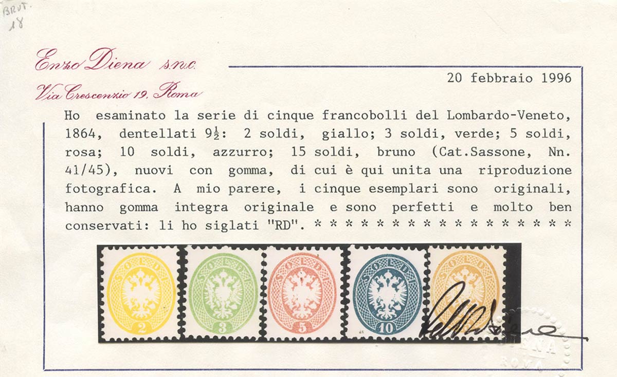 Lotto 47 | 1864, N.41/45 nuovi con gomma integra. (Lux) (Cert. E. Diena) (Cat.5.910++)