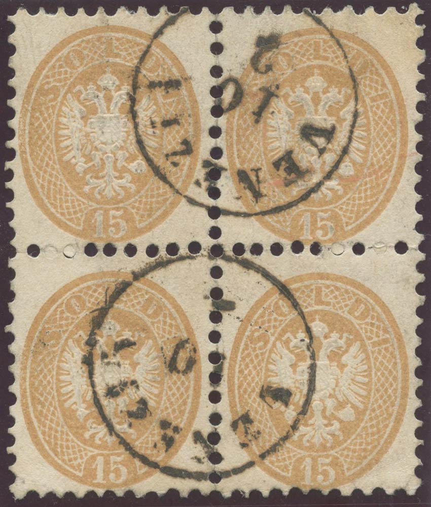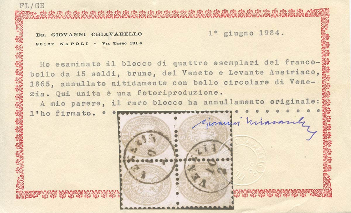 1864, 15s. N.45 Bruno in quartina usata. (A) (Raybaudy, cert. Chiavarello) (Cat.8.500)