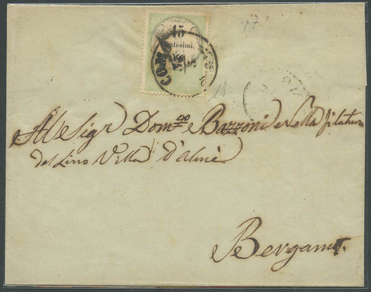 Lettera da Como per Bergamo affrancata con una Marca da Bollo da 15c. N.3 (Caratteri Tipografici) con annullo CO di COMO (7pt.). (A) (Cat.1175)