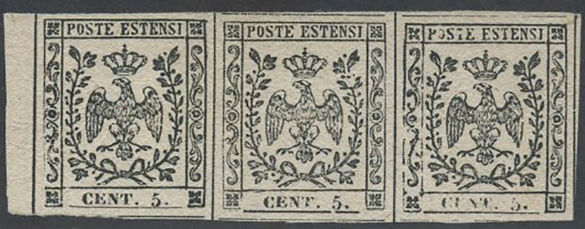 Lotto 65 | Prova del tipo adottato (Vacc. N.1PR) 5c. Bianco su carta Vergata orizzontalmente in striscia di tre con bordo di foglio a sinistra. (Lux)