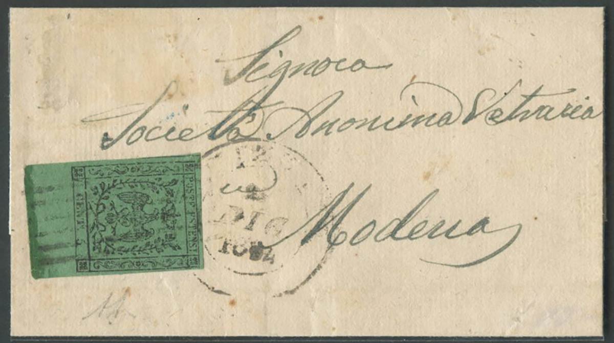 Lotto 70 | Lettera da Fivizzano per Modena affrancata tramite un 5c. Verde N.1 con bordo di foglio in basso. Sull'affrancatura le sei sbarre e il doppio cerchio di Fivizzano entrambi annullatori (6pt.). (Lux) (A.Diena) (Cat.1225)