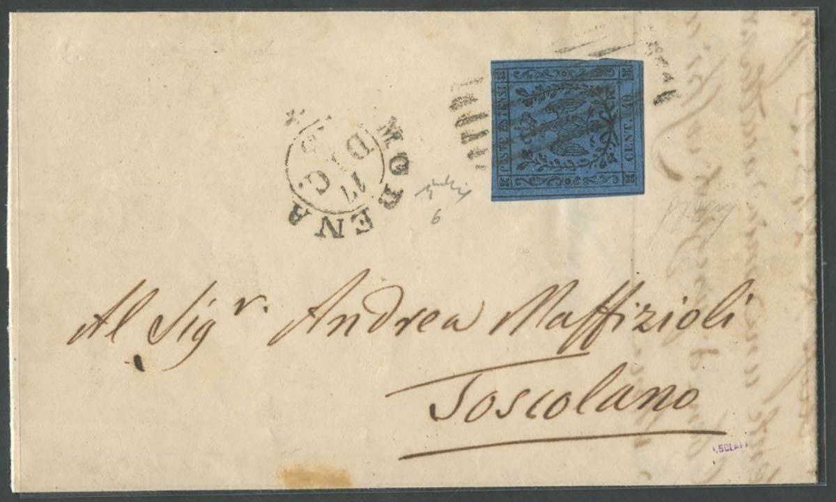 17.12.1853, Lettera da Modena per Toscolano affrancata tramite un 40c. Azzurro scuro N.6. Primo porto per la 3° distanza dal confine Lombardo. (A+) (Chiavarello) (875++)