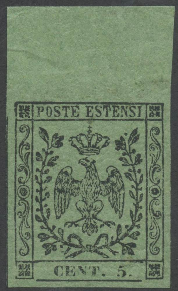 1852, 5c. Verde Oliva N.8 nuovo con gomma integra, bordo di foglio in alto. Il francobollo presenta una piccolissima trasparenza di carta che, dopo aver esaminato con cura la gomma al verso che risulta perfettamente intattata, a nostro parere tale leggerissima trasparenza è originale della carta e non costituisce difetto. (Lux) (Cert.2400)