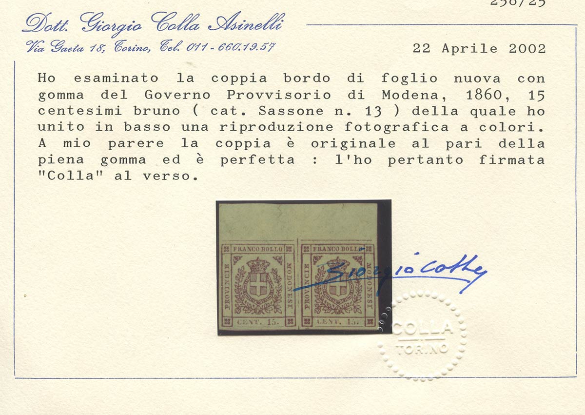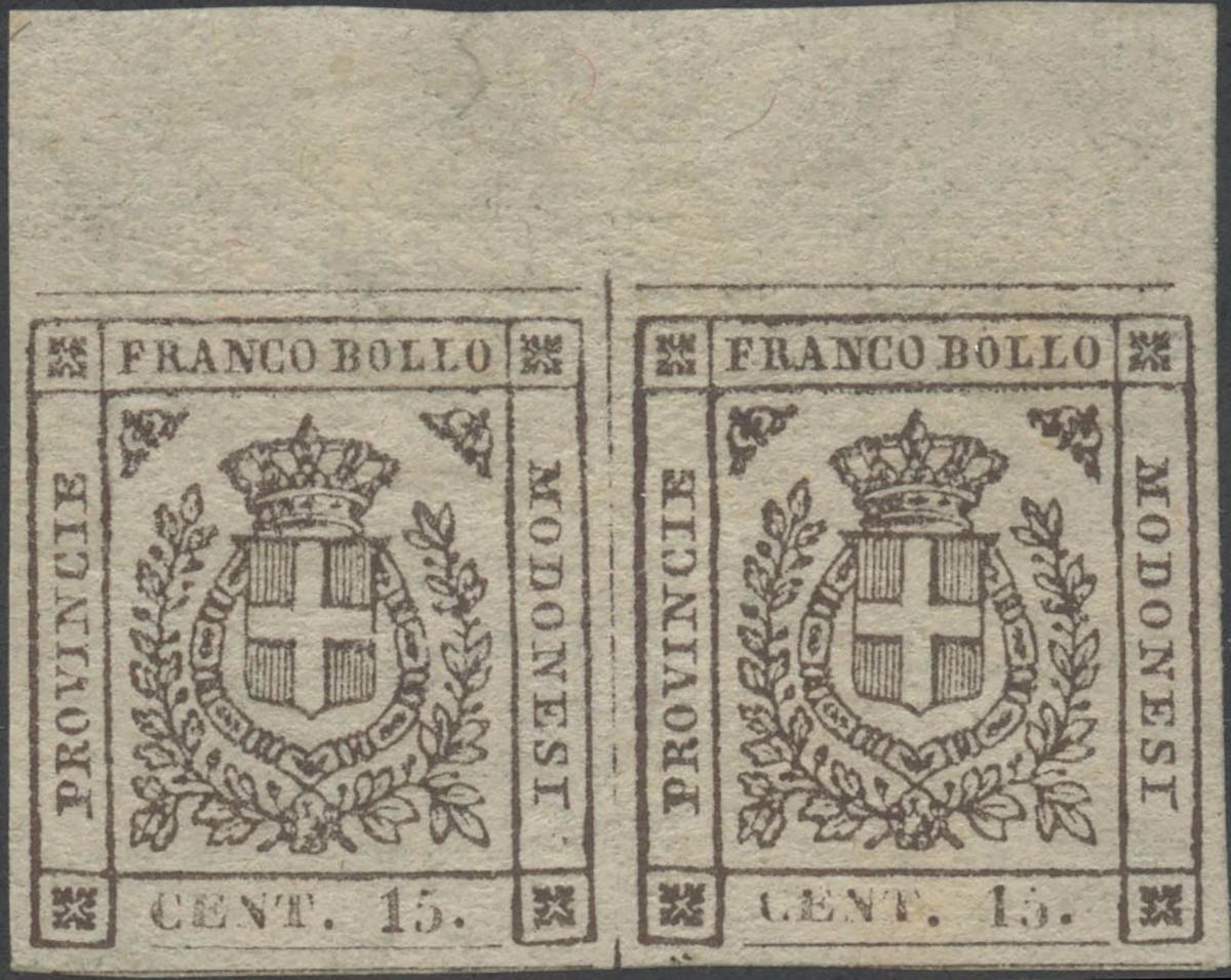Lotto 89 | 1859, 15c. N13a Bruno Scuro in coppia con bordo di foglio in alto, nuova con gomma integra. (Lux) (cert. Colla) (Cat.15.000++)