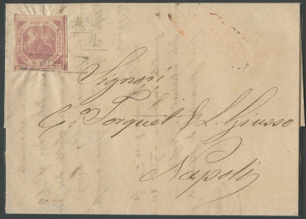 12.3.1858, Lettera da Aquila per Napoli affrancata con un 5gr. Rosa Lillaceo N.5a con evidente doppia incisione nel lato sinistro. (Lux) (A.Diena) (Cat.1600++)