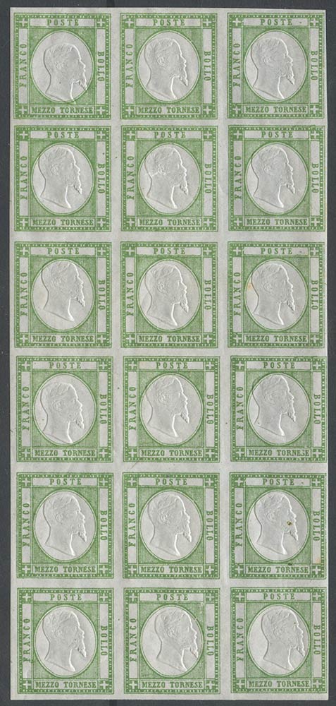 1861, 1/2gr. Verde N.17 in blocco di 18 nuovo con gomma integra. Tutti interessati da grande e piccola crinatura. (A+) (1440++)