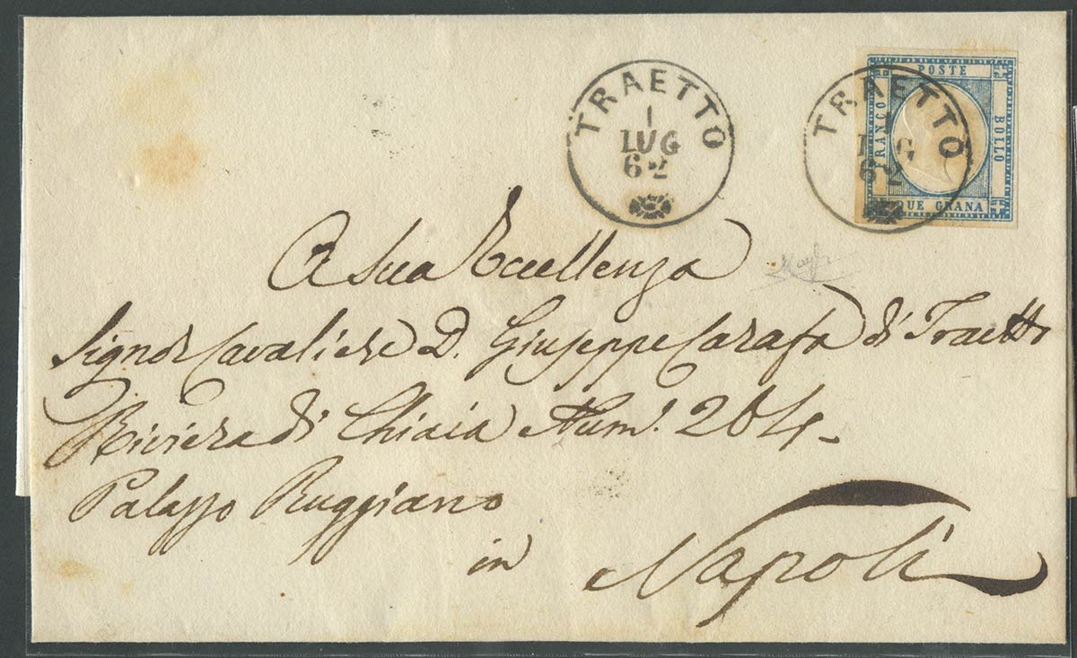 1.7.1862, Lettera da Traetto per Napoli affrancata tramite un 2gr. Azzurro Chiaro N.20. Sull'affrancatura il cerchio di TRAETTO (6pt). (A) (Raybaudi) (400)