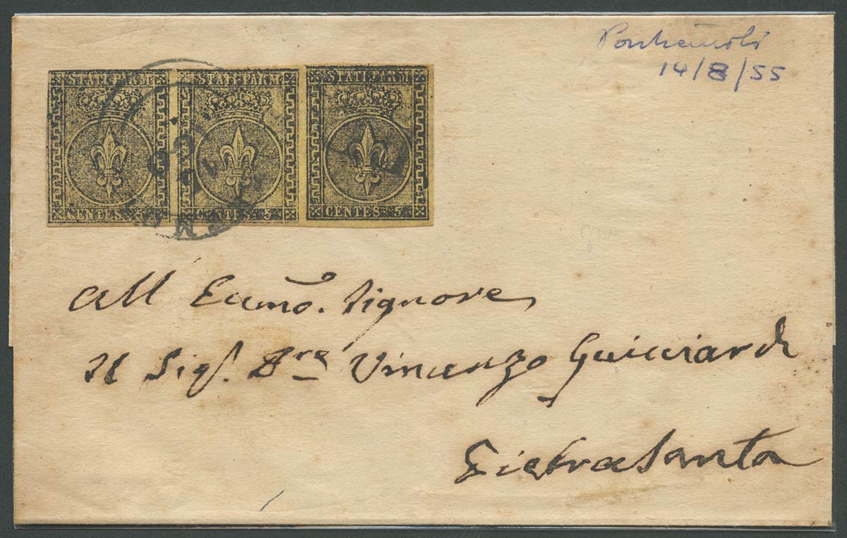 14.08.1855, Lettera da Pontremoli per Pietrasanta affrancata tramite una striscia di tre del 5c. N.1 Giallo Arancio (Primo porto per la prima distanza nel Ducato di Toscana) (A-) (Cat.3500++)
