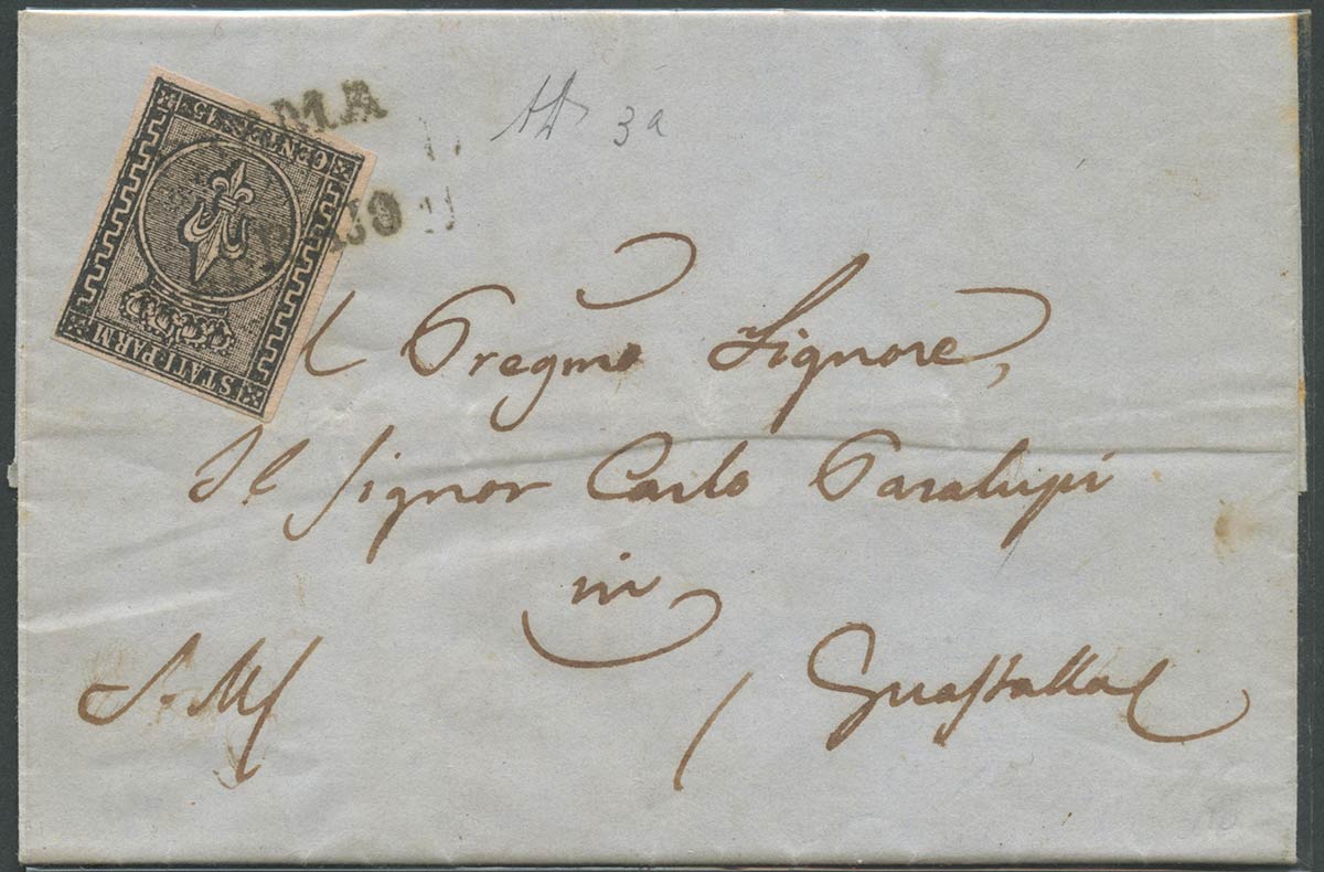 22,02,1853. Lettera da parma per Guastalla affrancata tramite un 15c. Rosa N.3 (tariffa di primo porto per le lettere spedite nel ducato di Modena). (A+) (A.Diena) (500++)