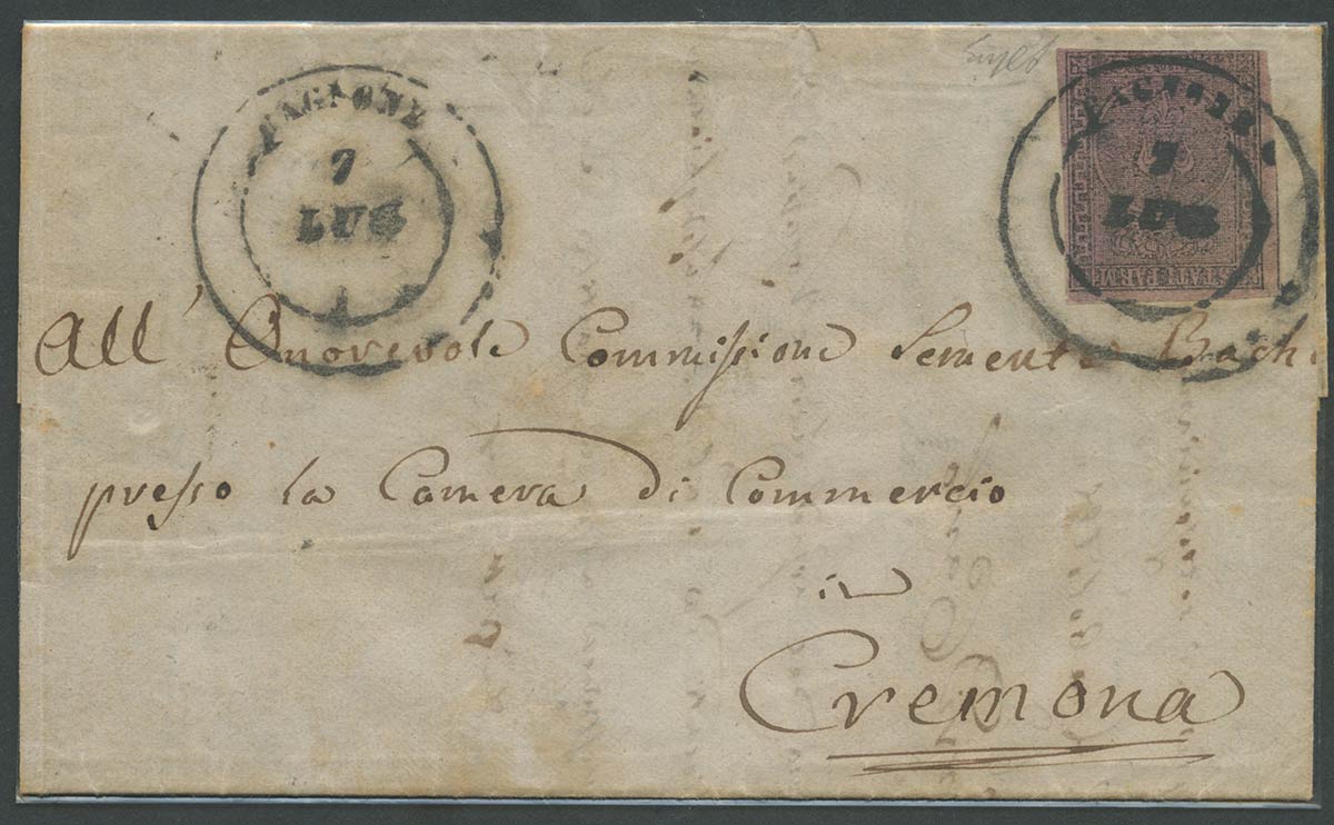 Lotto 186 | 5.7.1859, lettera da Bagnone per Cremona in periodo di II° Governo provvisorio, affrancata tramite un 25c. Violetto N.4. Sull'affrancatura il Doppio cerchio grande di Bagnone(11pt.) (A-) (Oliva) (Cat.4500++)