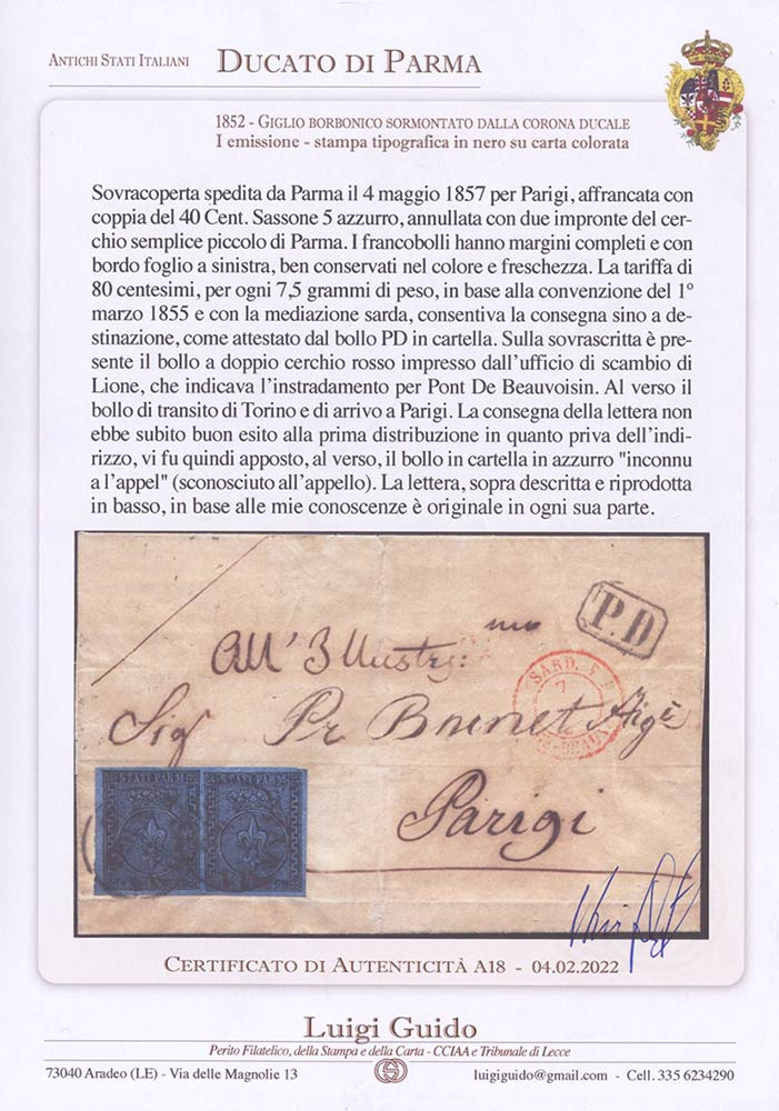 Lotto 188 | 4.4.1857, Sovracoperta spedita da Parma per Parigi affrancata tramite una coppia di 40c. Azzurro N.5. (Lux) (Cert. Luigi Guido) (Cat.14000)