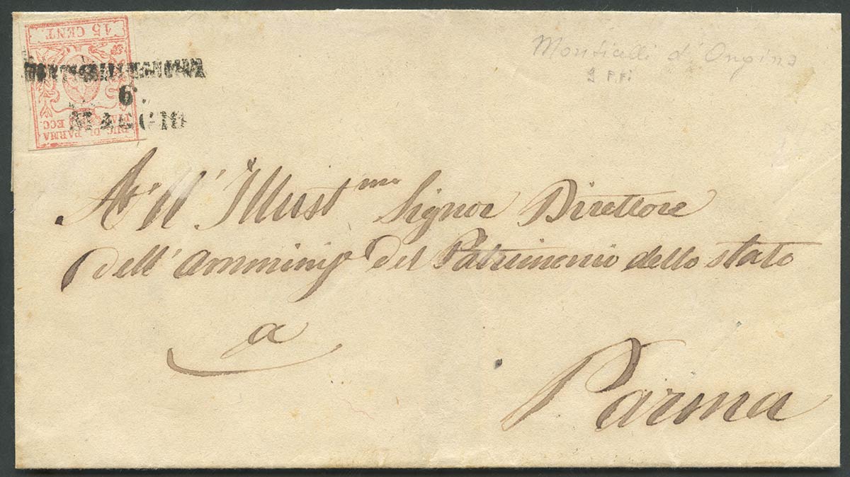 6,5,1859, lettera da Monticelli D'ongina per Parma affrancata tramite un 15c. Vermiglio N.9. Sull'affrancatura il Lineare su tre righe di Monticelli D'ongina(9.pt). (A-) (Cat.3350)