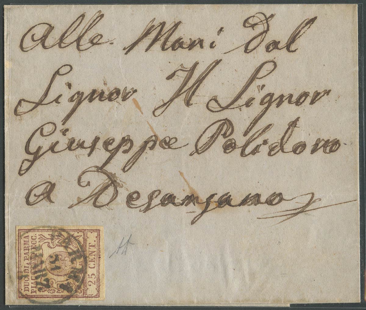 31.03.1858, Lettera da Parma per Desenzano affrancata con un 25c. Bruno Lilla N.10. (Tariffa di primo porto per la II distanza del Lombardo veneto) (A+) (A.Diena) (Cat.1250)