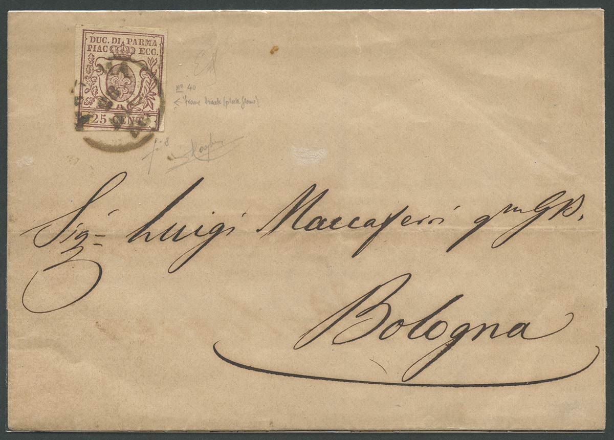 28.12.1858, lettera da Parma per Bologna affrancata tramite un 25c. Burno Lilla N.10. Interessante difetto di stampa nella cornice di destra. (Lux) (Raybaudi, Em.Diena) (Cat.1250)