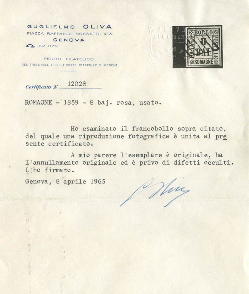 Lotto 221 | 1859, 8b. Rosa N.8, usato. (A+) (Cert. G.Oliva) (Cat.3250)