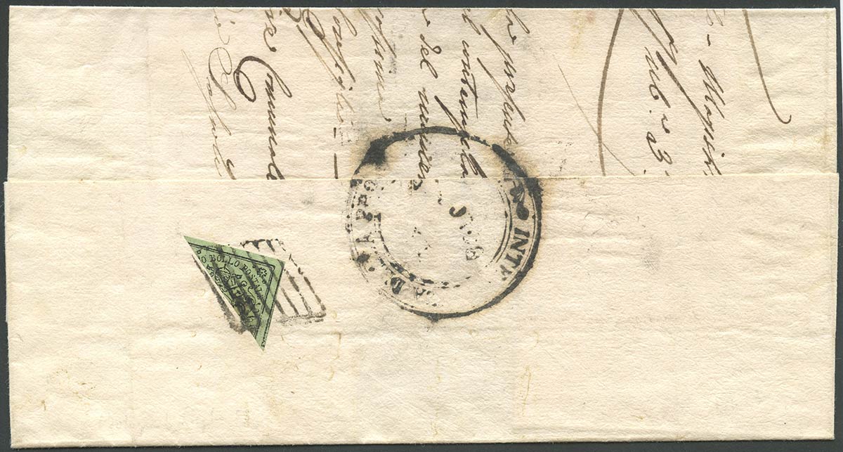 Francobolli dello stato pontificio utilizzati nelle Romagne durante il governo provvisorio.2b.. Frazionato per 1/2 su lettera del 6 Luglio 1859