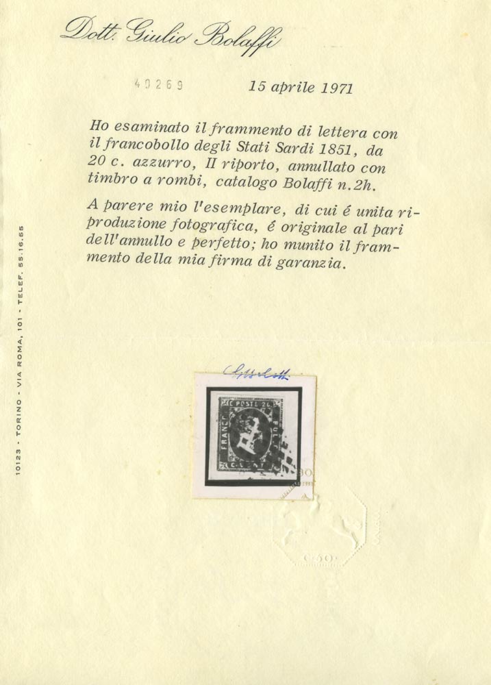 1851, 20c. Azzurro N.2 appartenente al raro II riporto, su frammento. (Lux) (A. Diena, cert. Bolaffi)(Cat.550++)