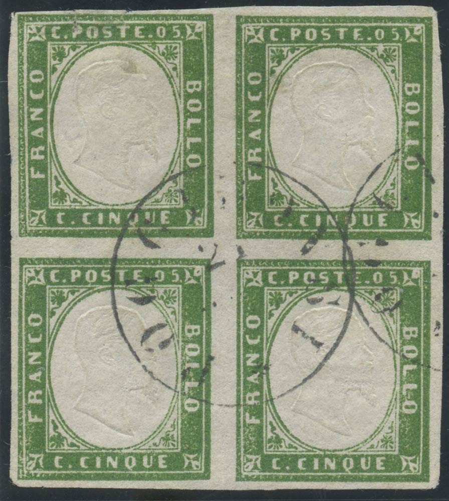 1862, 5c. Verde Giallastro 13Da in quartina usata a POGGIBONSI. Il valore in alto a sinistra è difettoso per via di un piccolo strappo. (A-) (Cat.10000++)