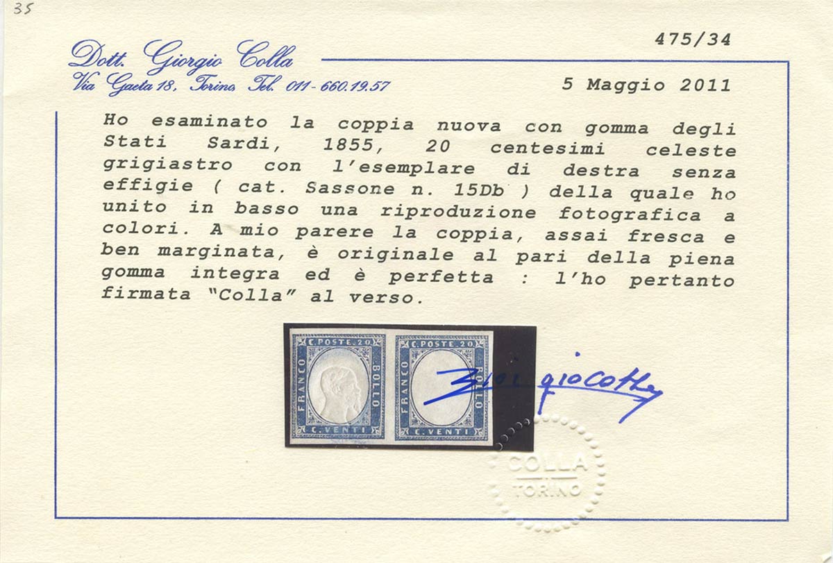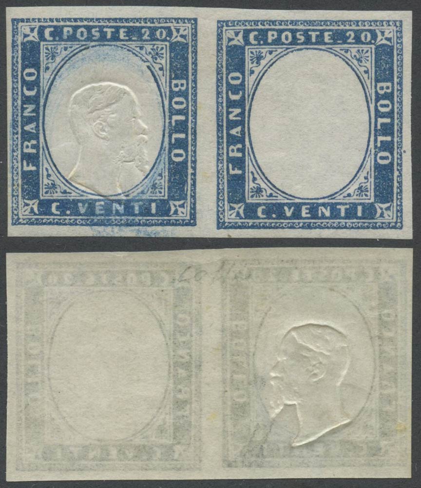 Lotto 278 | 1861, 20c, N.15Db Celeste Grigiastro, coppia nuova gomma integra. Il francobollo di destra è senza effige. (Lux) (A. Diena, Cert. Colla) (Cat.5.500)