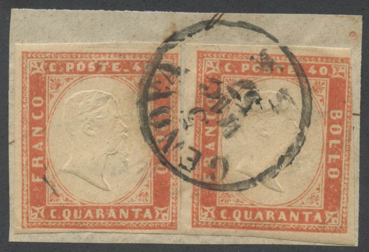 1857, 40c. Vermiglio tenue (Tonalità Particolarmente Tenue) due esemplari su frammento. Uno perfetto l'atro corto a destra. (A+/B) (A.Diena, Raybaudi) (Cat.1700)