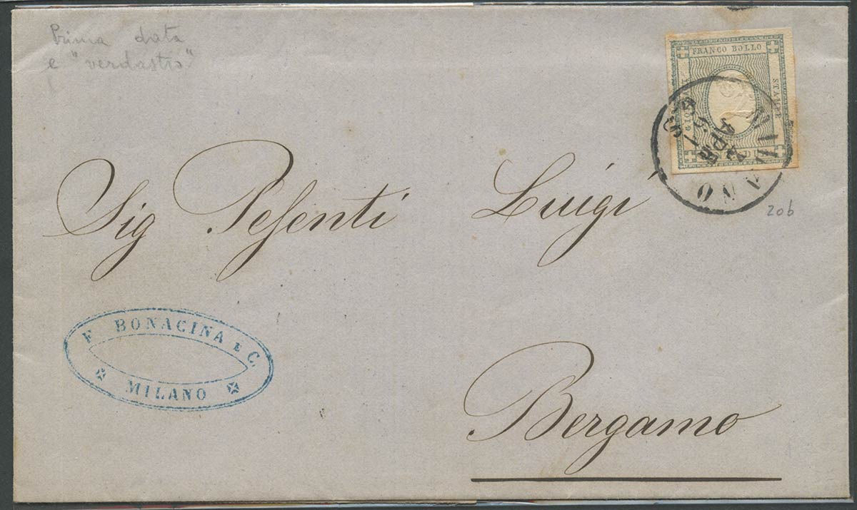 4.4.1861, lettera da Milano per Bergamo affrancata con un 2c. Grigio Verdastro. (A) (Cat.350)