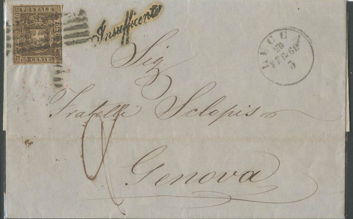 20.2.1860, Lettera da Lucca per Genova affrancato con un 10c. Bruno N.19 annullo ''insufficiente'' in corsivo, tassata. (A+) (Cat.350++)