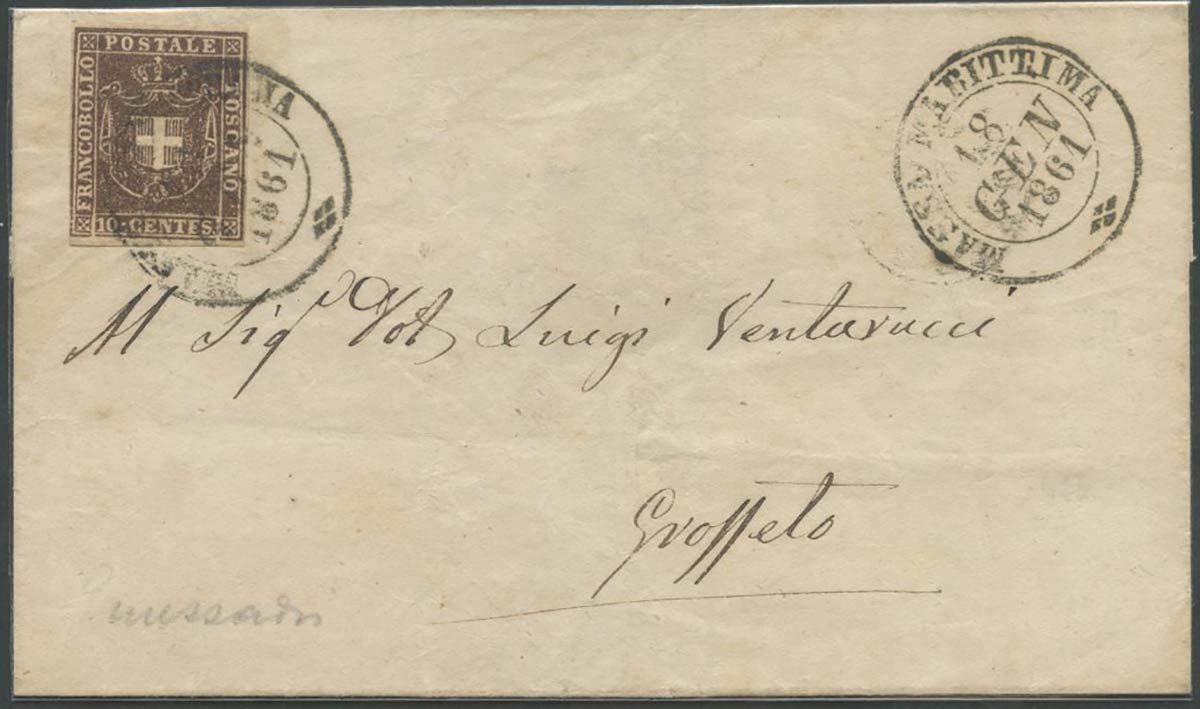 18.1.1861, Lettera da Massa marittima per Grosseto affrancata tramite un 10c. Bruno N.19. Sull'affrancatura il doppio cerchio grande di MASSA MARITTIMA (7pt.) (Cat.900)