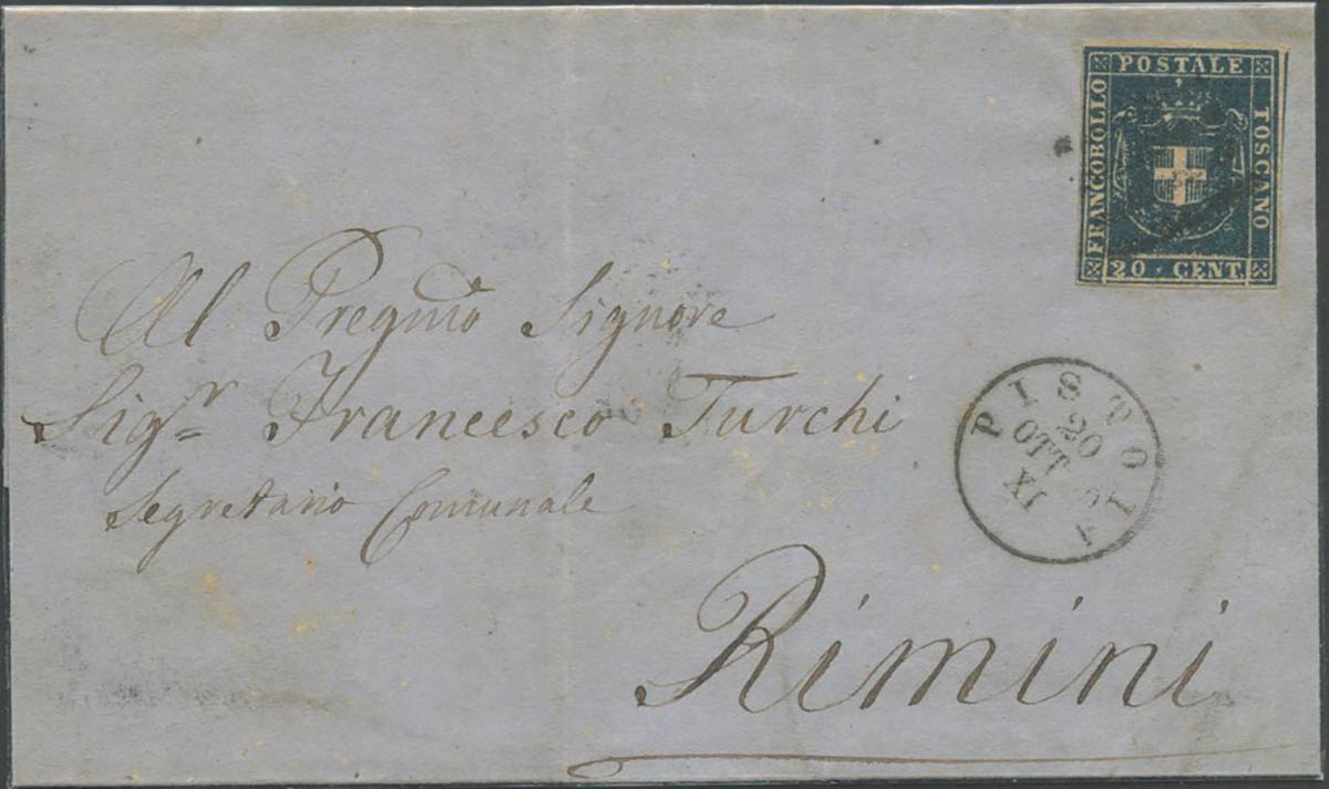 20.10.1860, Lettera da Pistoia per Rimini affrancata tramite un 20c. Azzurro Cupo N.20d. Sull'affrancatura il muto a tre sbarre di Pistoia. (A+) (1400++)
