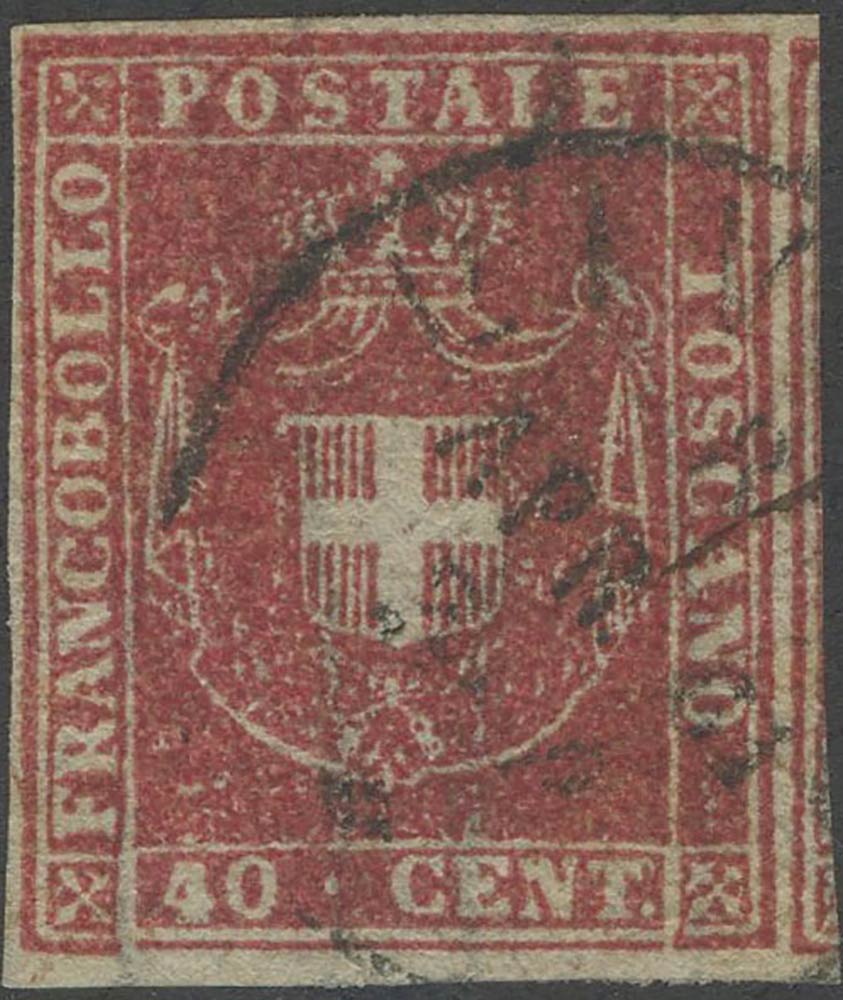 Precedente Lotto 409 Successivo Bertolami Fine Art - Piazza Lovatelli 1, 00186 Roma Web Auction 114 - Filatelia Sessione Unica martedì 5 aprile 2022 ore 12:00 (UTC +01:00) 1860, 40c. Carminio N.21, usato. (A+) (Cat.600) 1860, 40c. Carminio N.21, usato. (A+) (Cat.600)