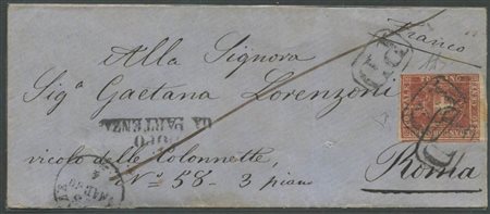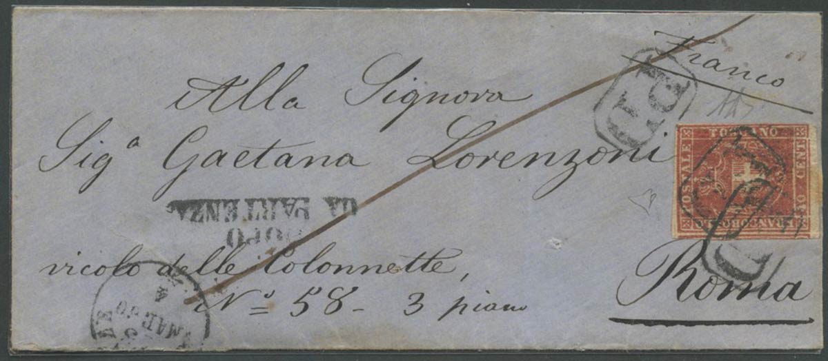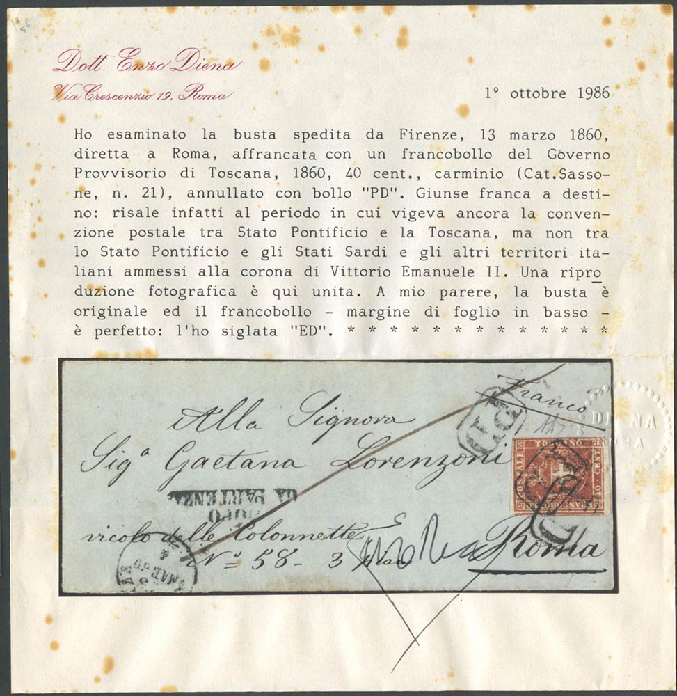 13.3.1860, Lettera da Firenze per Roma affrancata tramite un 40c. Carminio N.21. Tariffa di primo porto per la terza distanza Pontificia.(A) (A.Diena, Cert. En.Diena) (Cat.3300++)