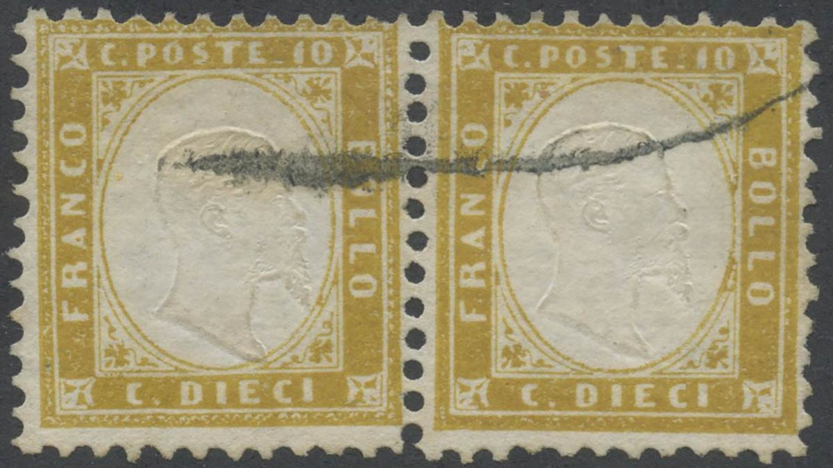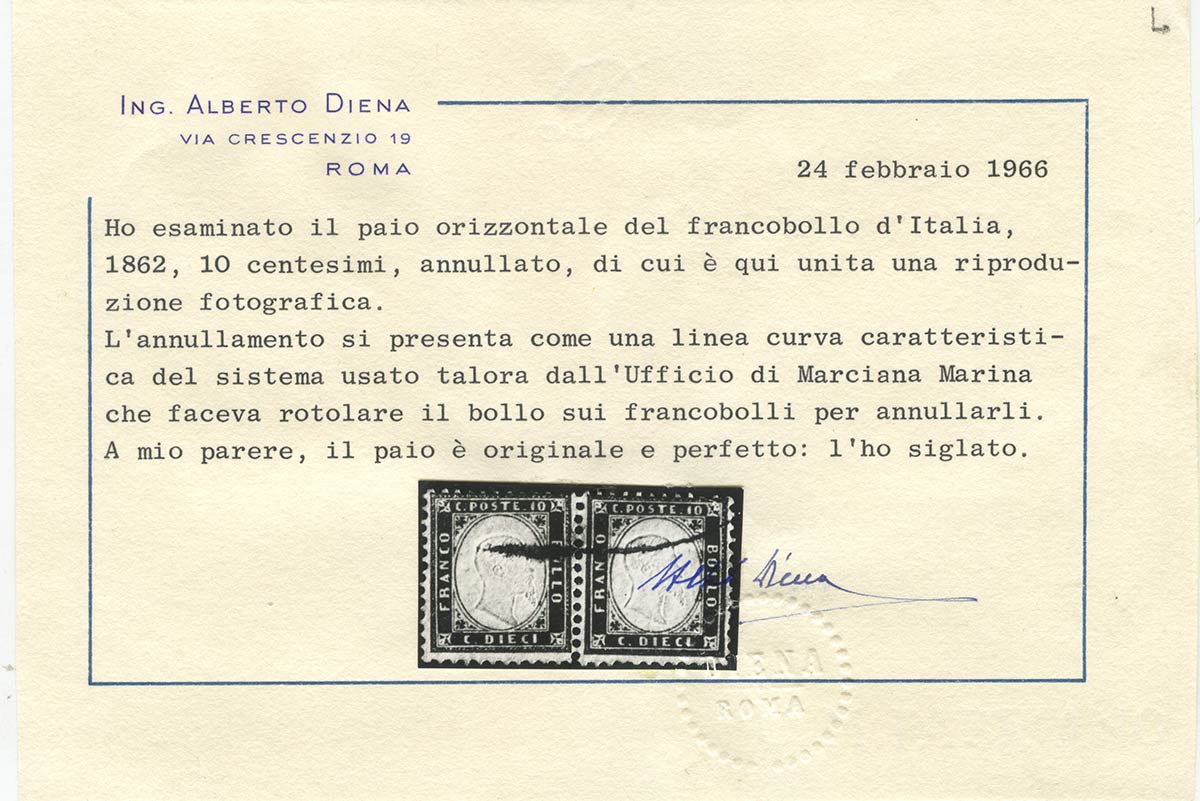 1862, 10c. Bistro Giallastro N.1 in coppia annullata a penna. Cert.A. Diena