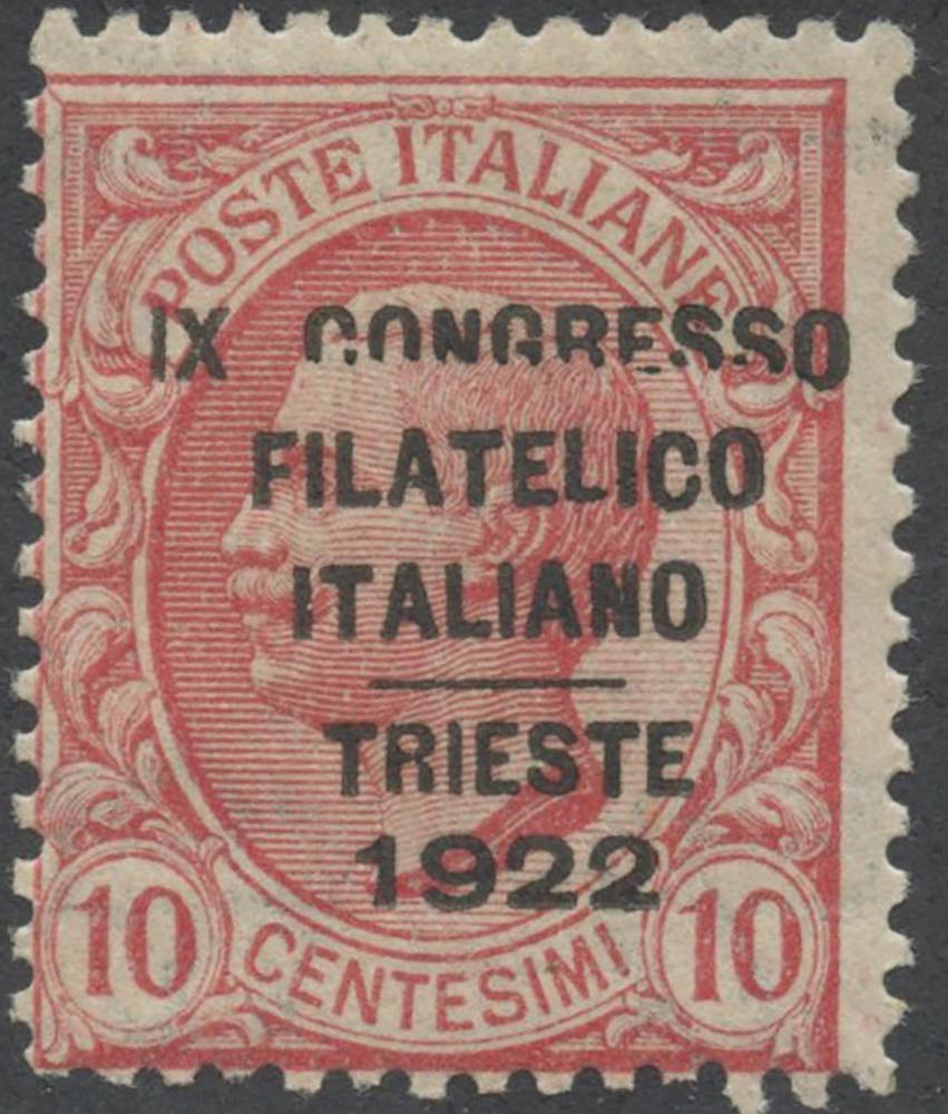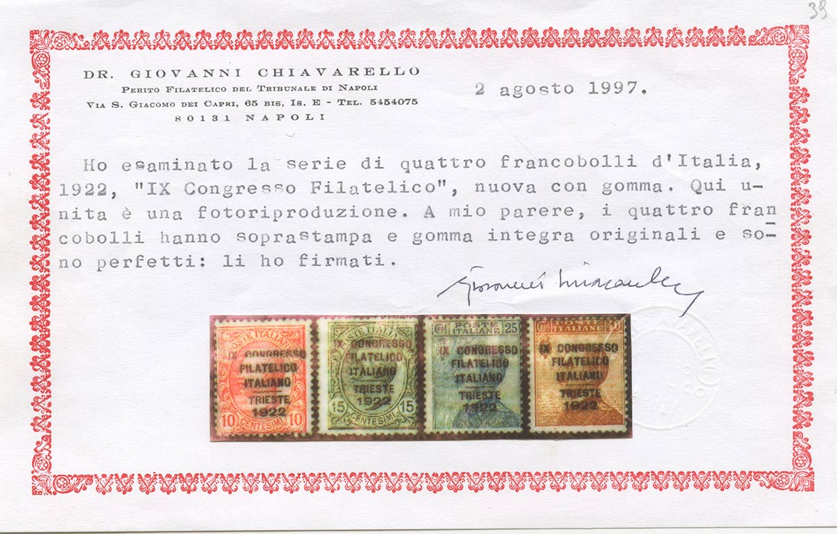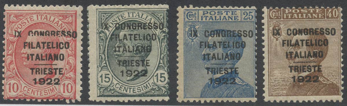 1922, Congresso filatelico N.123/126 nuovi con gomma integra. Il 10c presenta una varietà inedita dicitura ''Congresso'' incompleta. Cert. Chiavarello.
