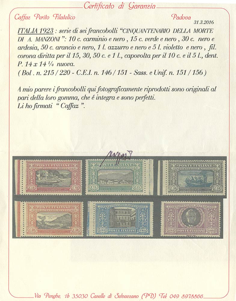 Lotto 428 | 1923, ''Manzoni'' N.151/156 nuovi con gomma integra. Cert. Caffaz