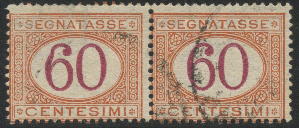 Segnatasse, 60c. In coppia usata. L'esemplare di sinistra con interessante deformazione della cifra.