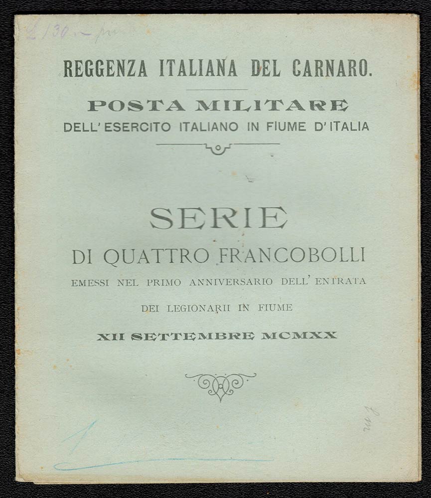 1920, Fiume. N.127/130 su cartoncino commemorativo e annullo di Posta Militare.