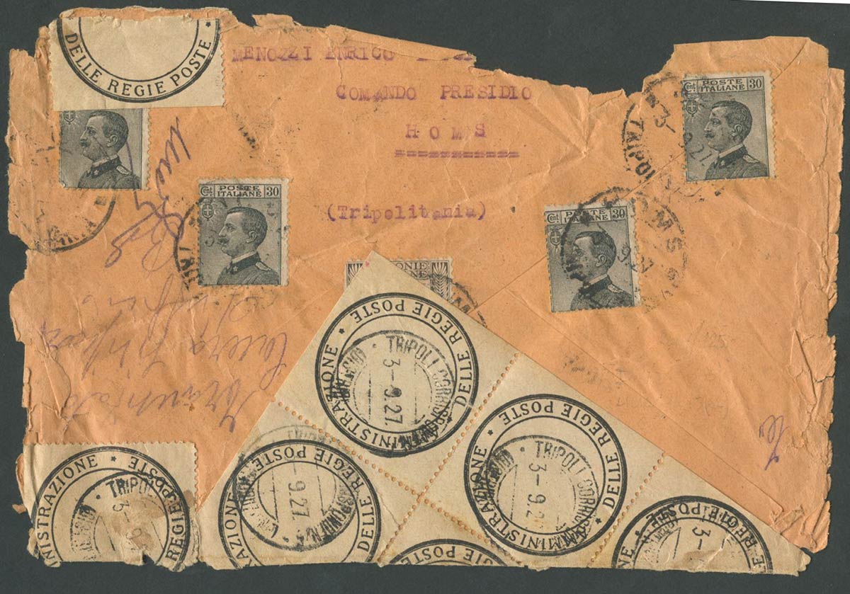 3.9.1927, lettera da Homs per Milano affrancata con serie Pittorica 10c. N.61 e quattro esemplari del 30c. Grigio n.185. Lettera lacerata durante la spedizione e ricostruita tramite i sigilli dell'amnistrazione delle Poste e rispedita a Tripoli