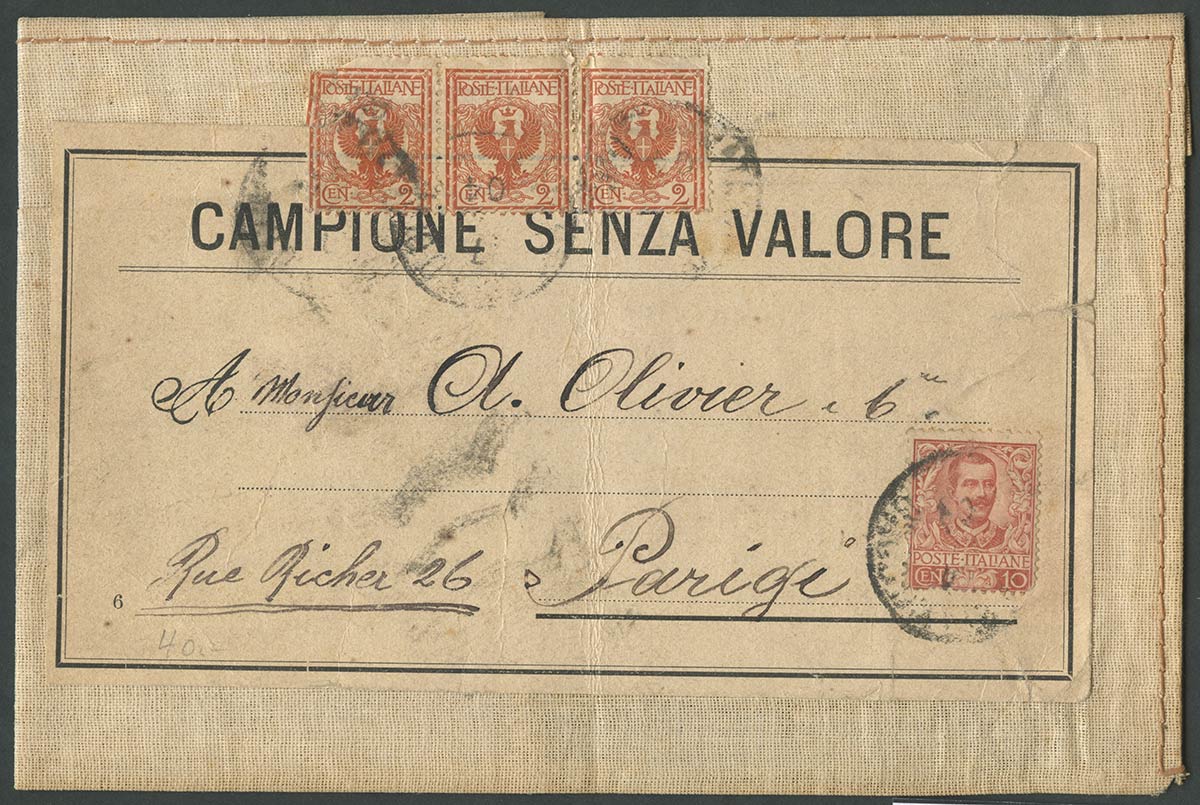 Lotto 499 | 'Campioni Senza Valore'' per Parigi affrancato tramite tre esemplari da 2c. N.69 + 10c. N71.
