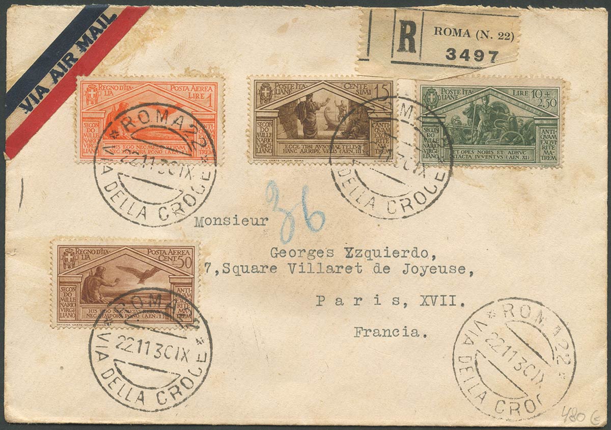 Lotto 502 | 22.11.30, Lettera spedita per via aerea da Roma per Parigi affrancata tramite i N.282, 290, A21,A22. Non comune l'alto valore conservato su documento.