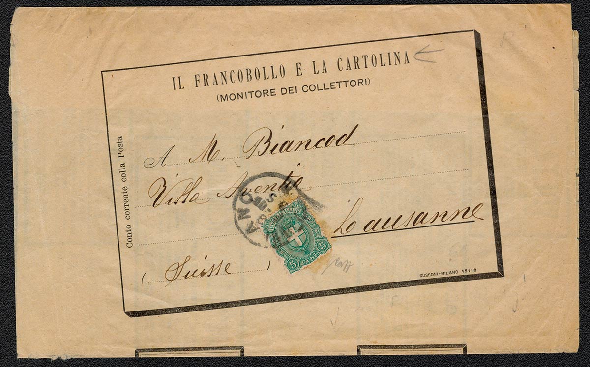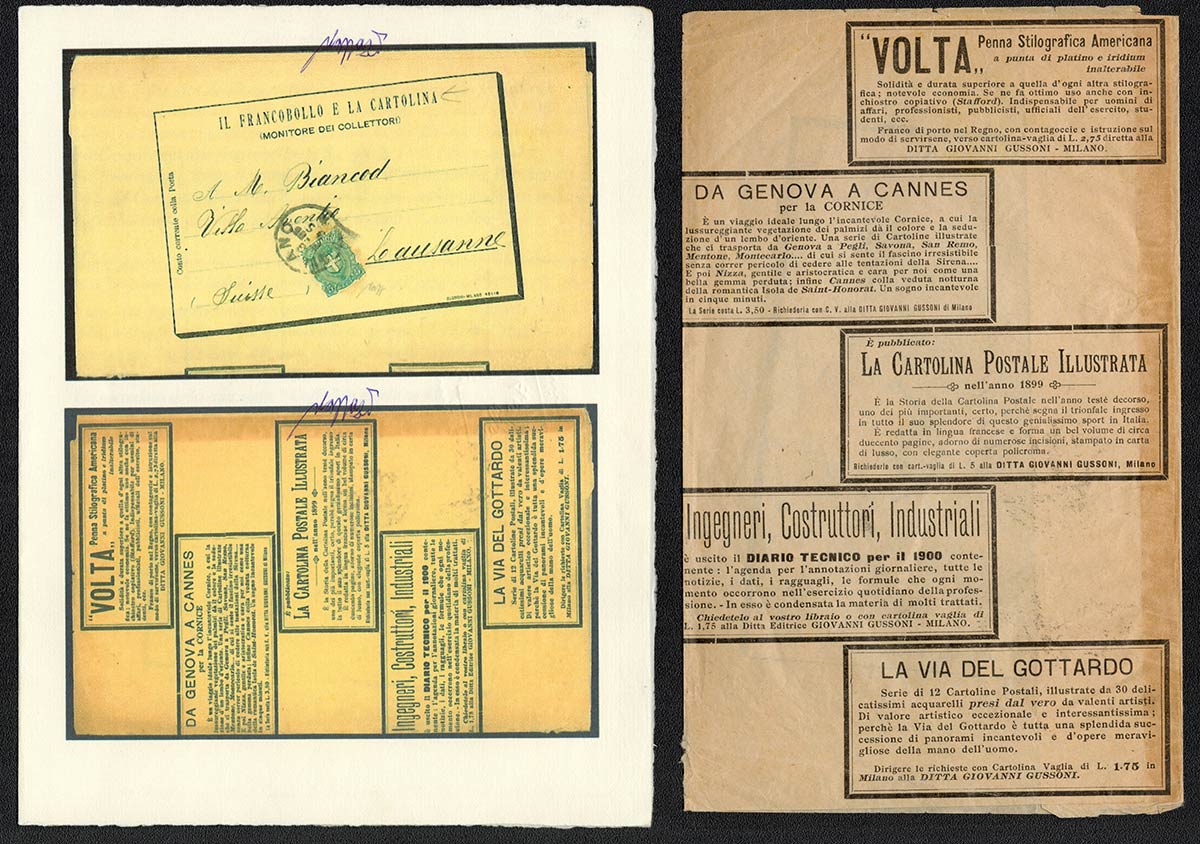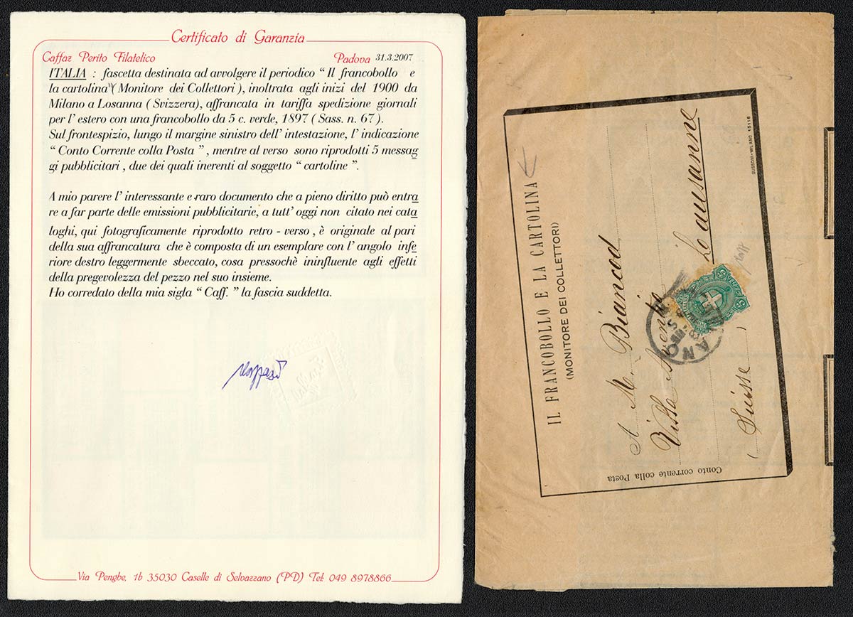 Fascetta destinata ad avvolgere il periodico ''Il Francobollo e la Cartolina'' affrancata tramite un 5c. Verde N.67 in tariffa per le spedizioni dei giornali all'estero. Al verso della fascetta sono riprodotti 5 messaggi pubblicitari. Citando il certificato di Caffaz ''A mio parere l'interessante e raro documento che a pieno diritto può entrare a far parte delle emissioni pubblicitarie''.