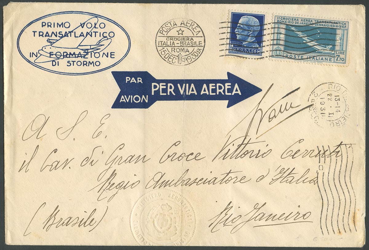 1930, Primo Volo Transatlantico Roma-Rio De Janeiro. Firme del Pilota e timbo a secco dell'aeronautica.