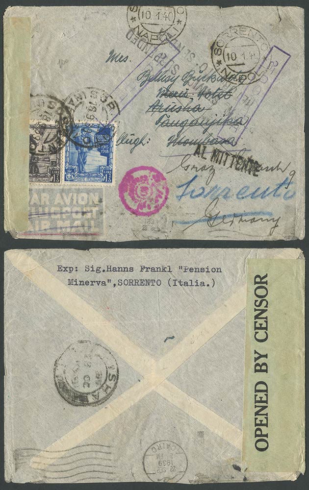 10.1.1940, Lettera spedita da Sorrento per Mombasa, intercettata dagli inglesi al Cairo, censurata e rispedita al mittente.