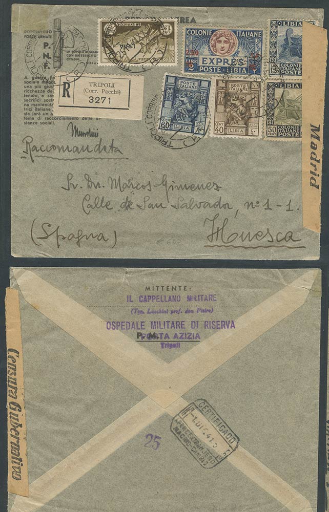 25.11.41, lettera da Tripoli per la Spagna nel periodo della guerra civile; censura spagnola sul lato. Affrancatura composta da Libia P.O. N.50,55,56,105 + Espresso N.10