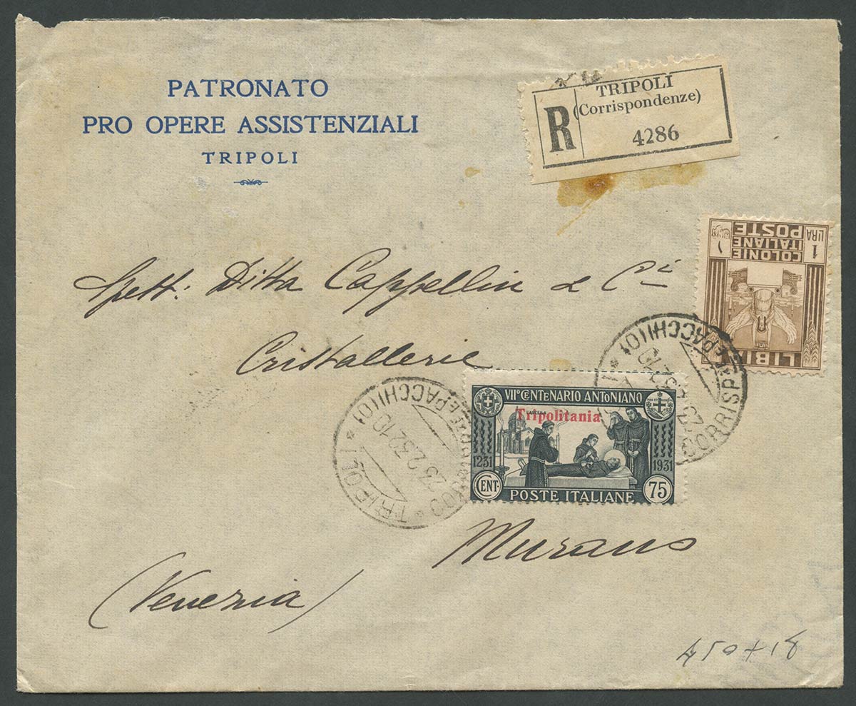 23.2.1932, Lettera raccomandata da Tripoli per Murano affrancata tramite un 75c. Soprastampato tripolitania N.91 e un francobollo di Libia N.65.