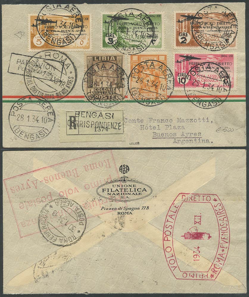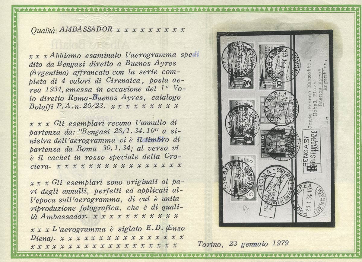 28.1.34, Aereogramma spedito da Bengasi per Buenos Ayres affrancato con la serie completa N.20/23. Cert. Bolaffi